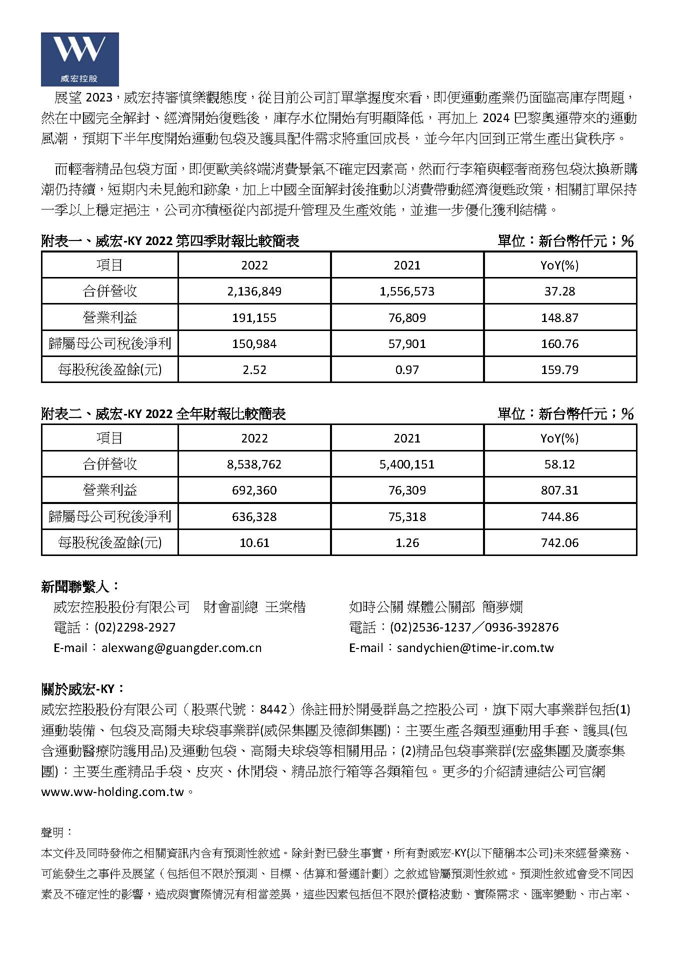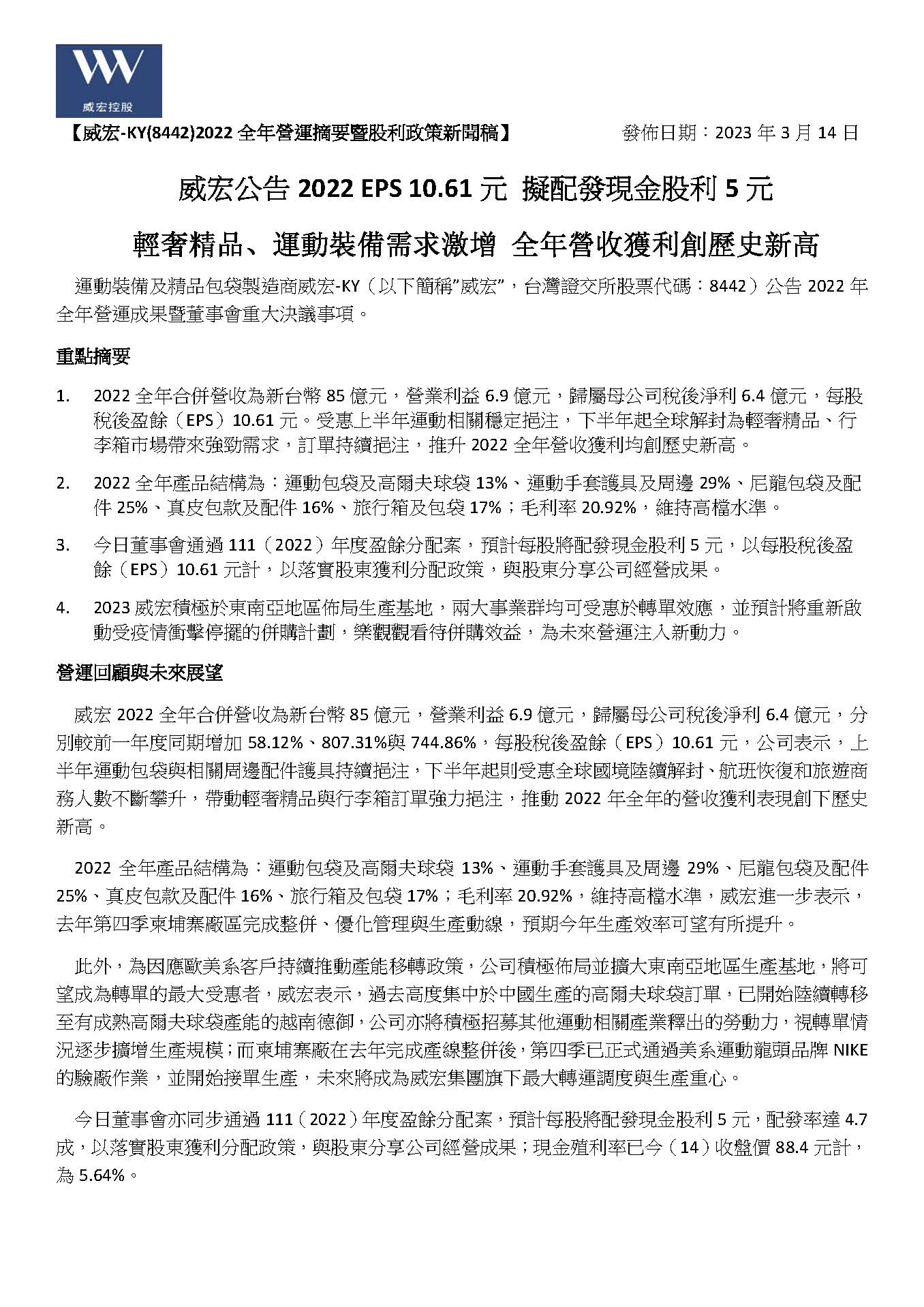 2023/03/14 威宏-KY(8442)2022全年營運摘要暨股利政策公告新聞稿